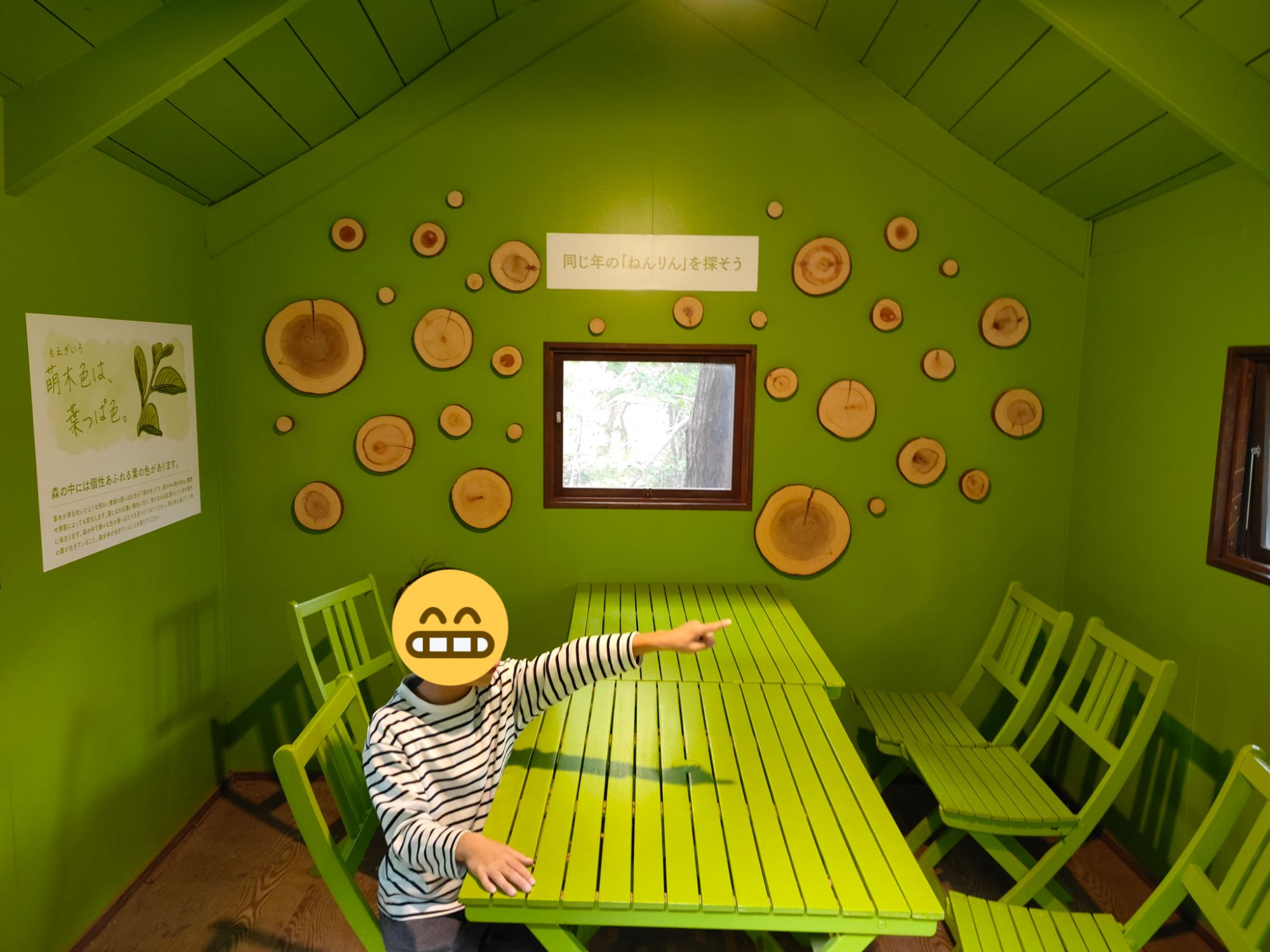 また、ツリーハウスの中はどれも特徴的で、彩りが綺麗でした。こちらは年輪の勉強にもなって親子で年輪を数えました。