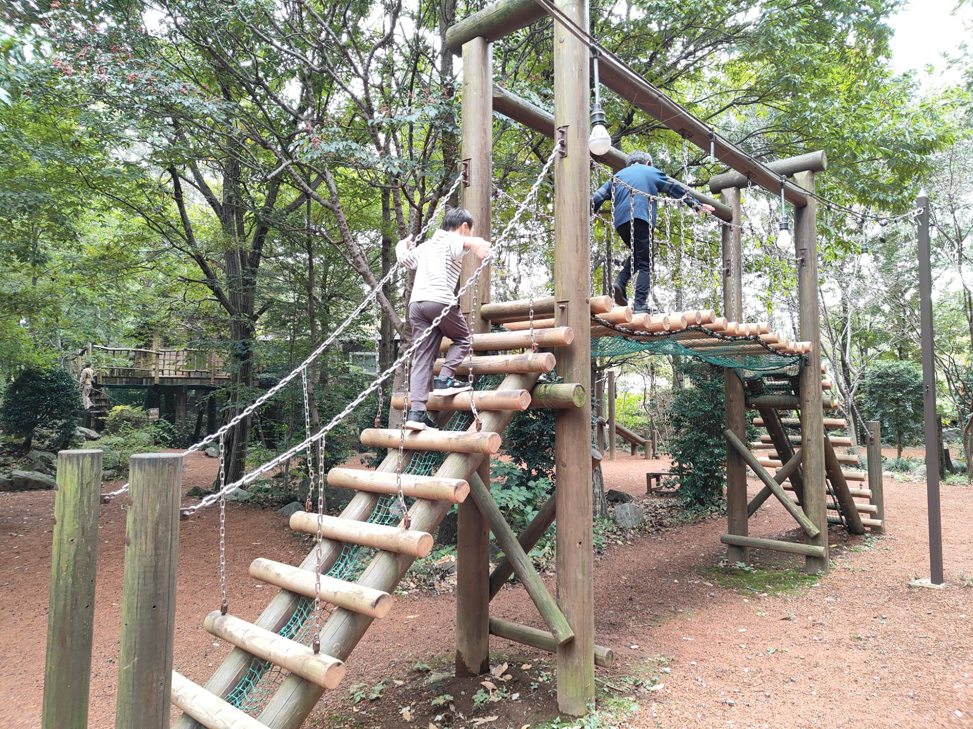 アスレチックでは汗だくになりながら挑戦し、親も一緒に体を動かしてリフレッシュ。
