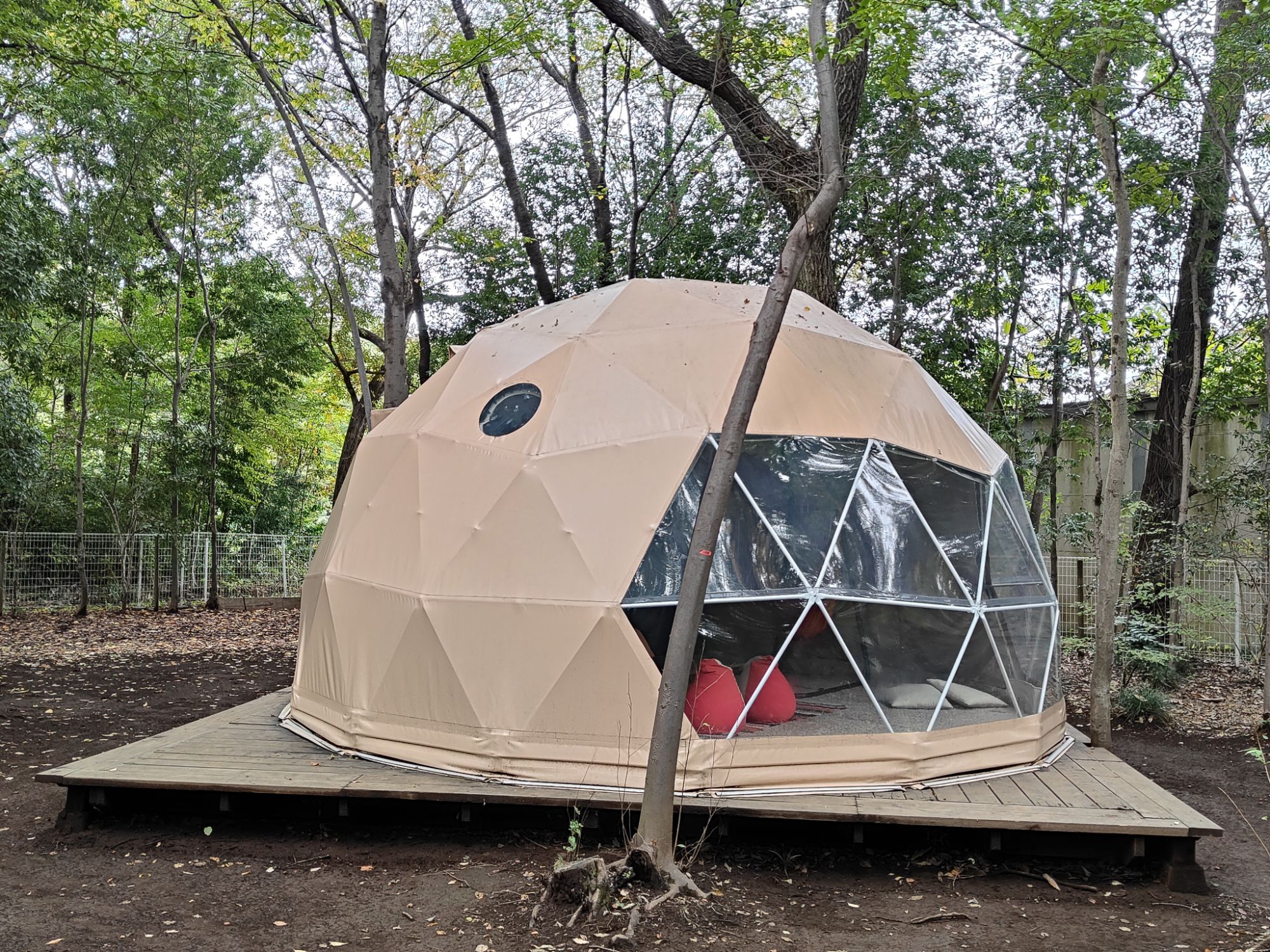おしゃれなドーム型のテントが森の中に。別途有料ですがデンキャンプも楽しめます。